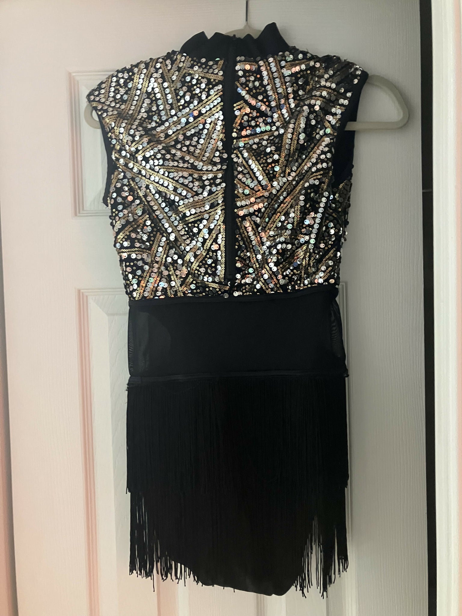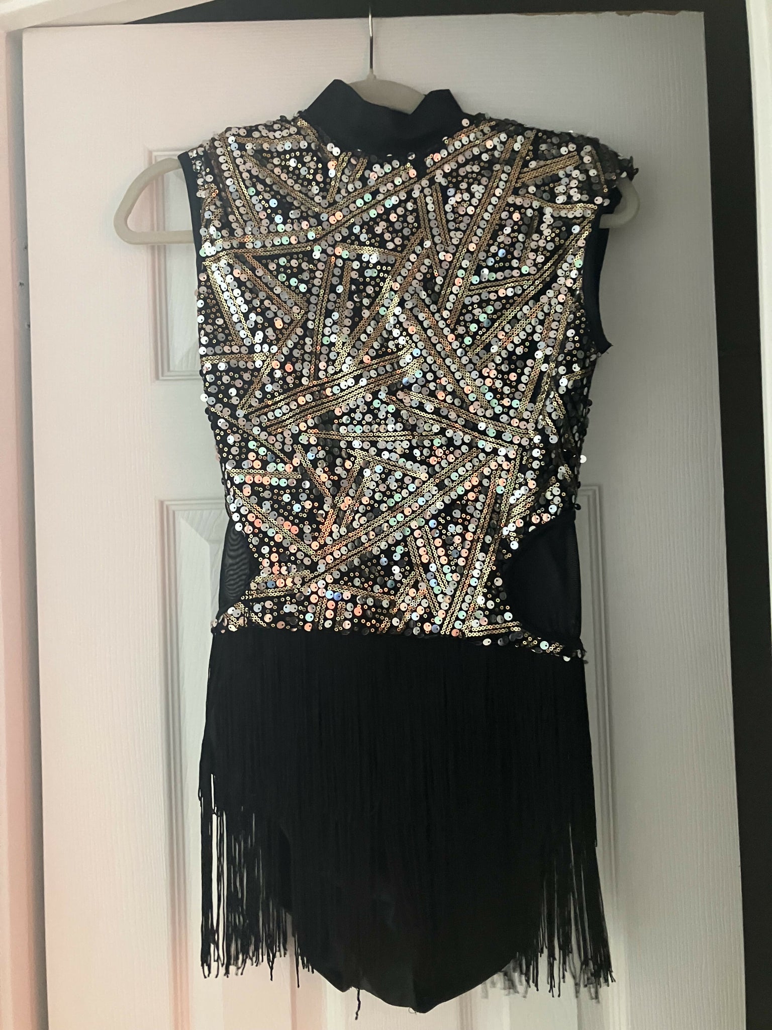 Good condition sparkle leotard-type costume with fringe and cutouts on the side.
