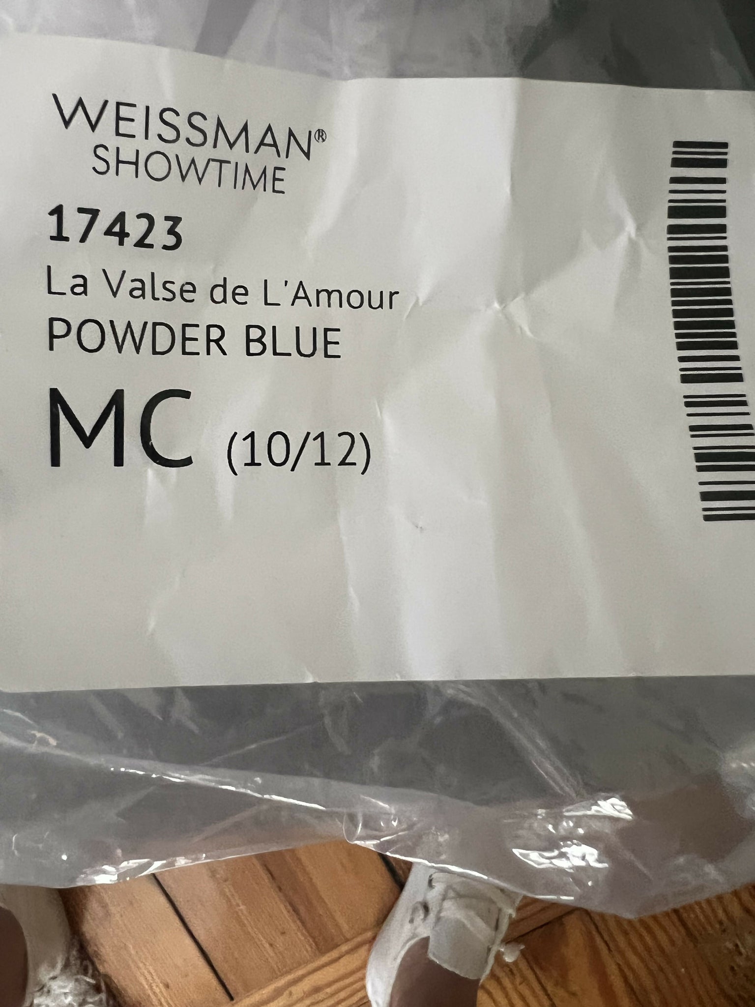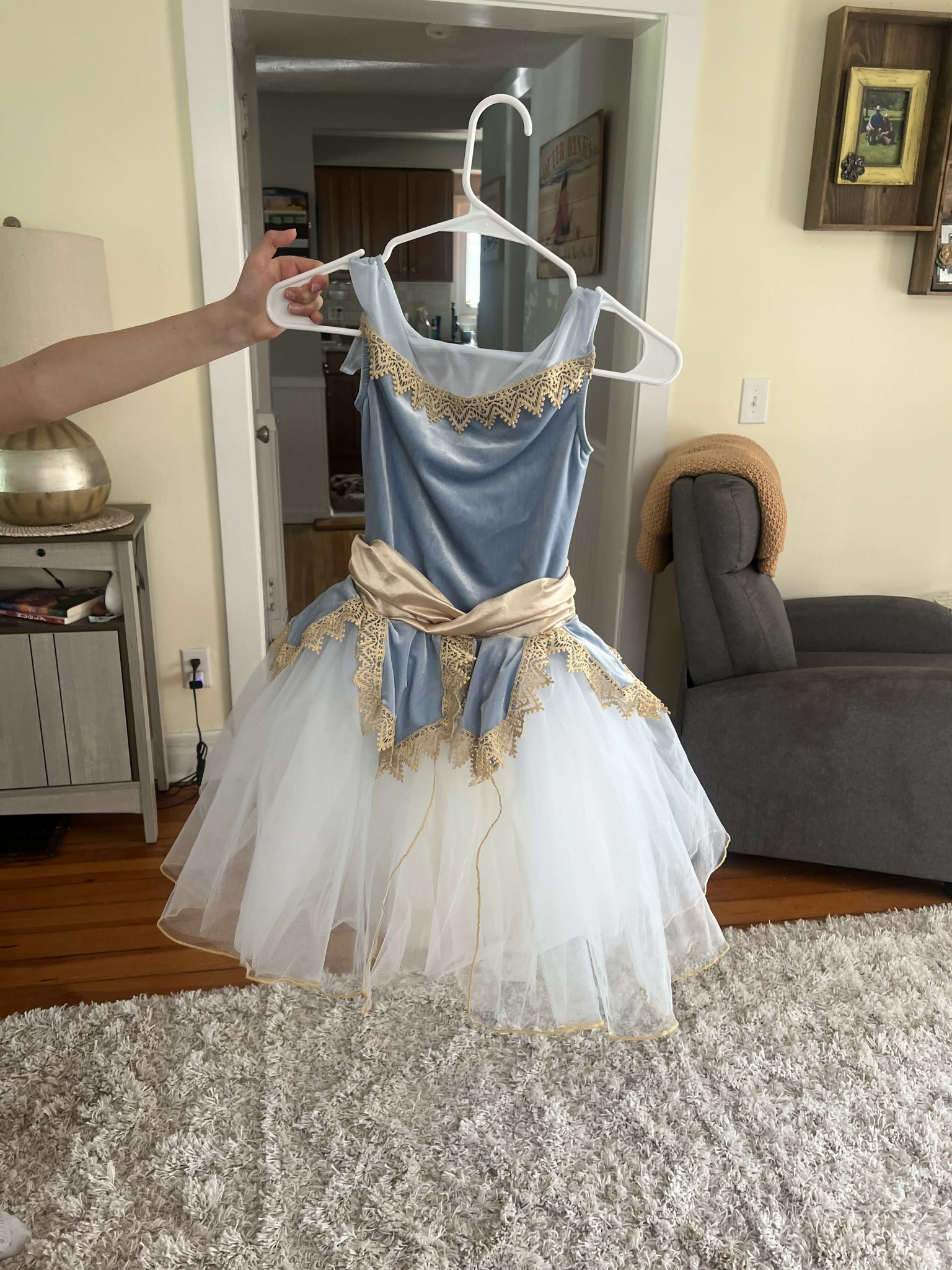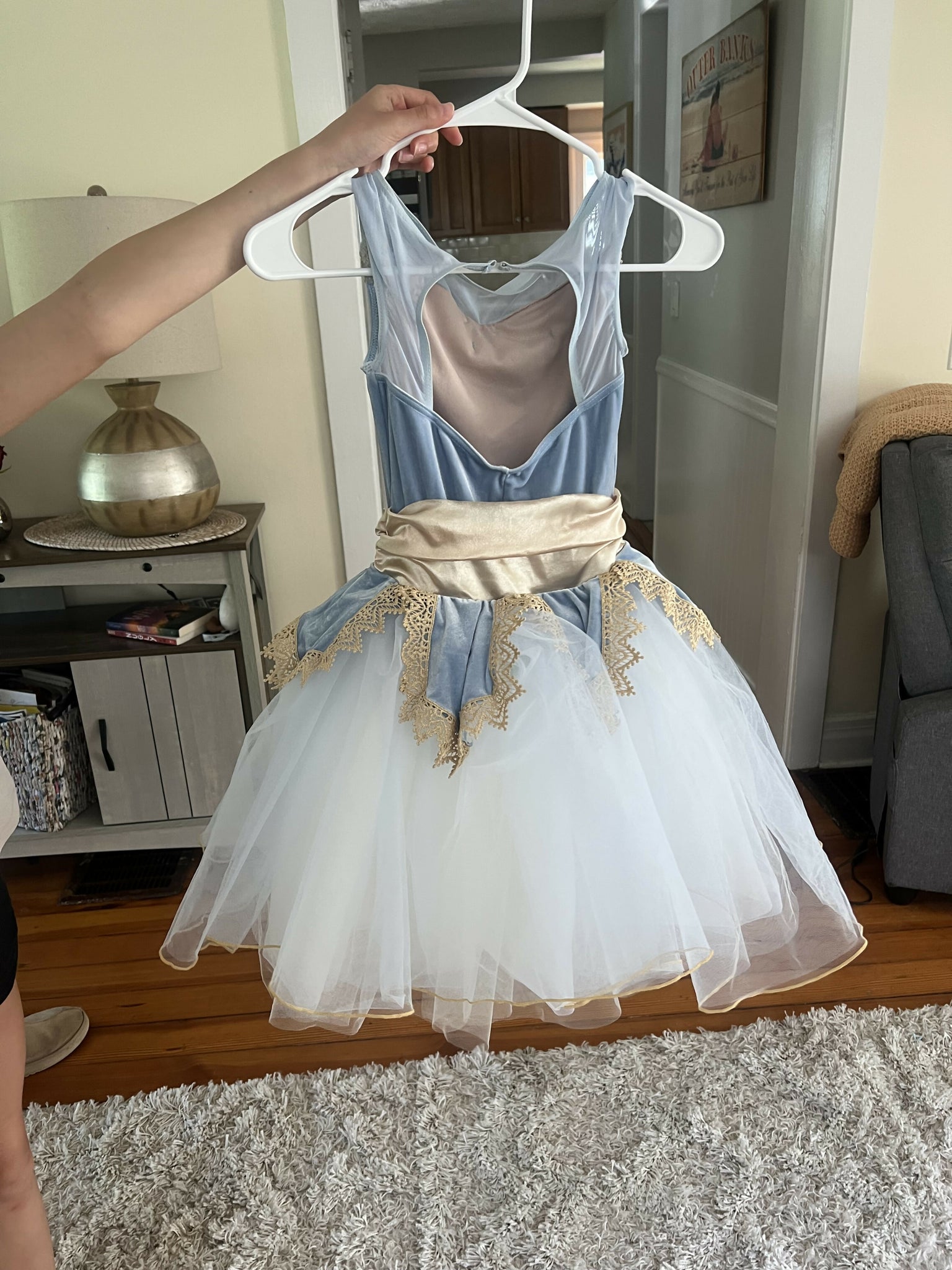 This is a stunning ballet piece that was only worn one time in a recital performance. The soft velour powder blue with the hold detail and trim is a vision of elegance  Costume was purchased for $130.00.