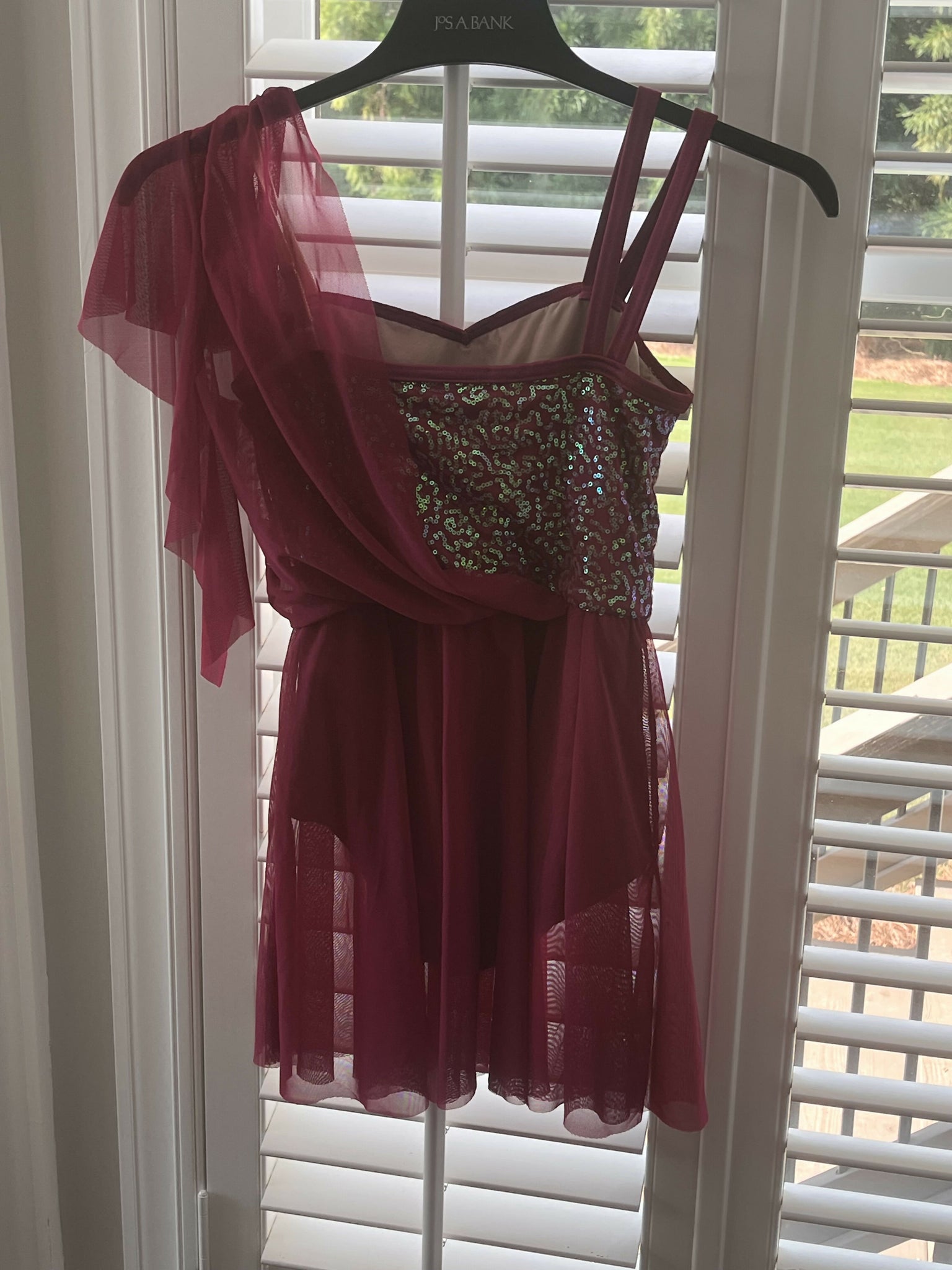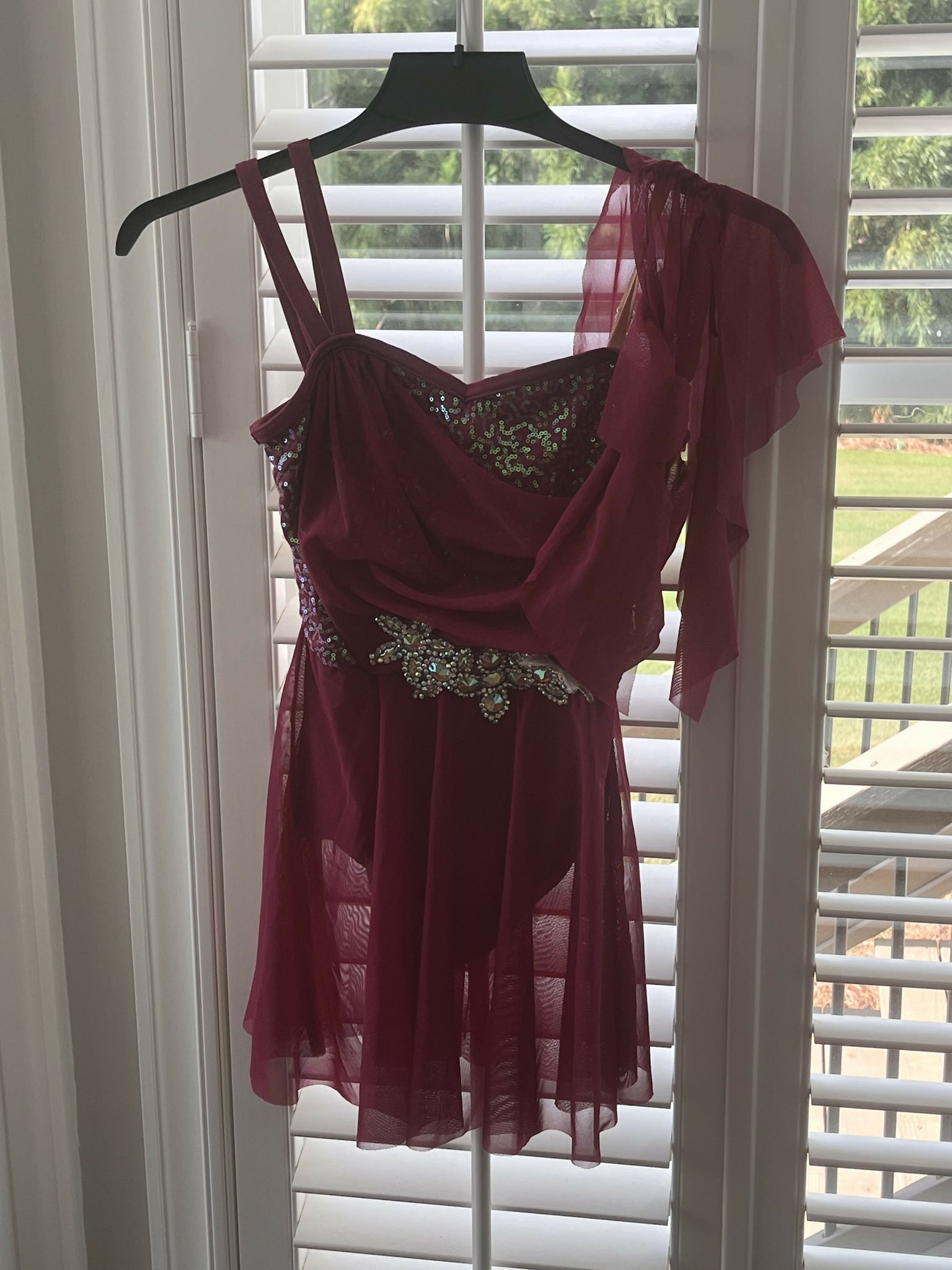 Weissman=Maroon lyrical one piece costume with sequined material on top and a mesh flowy skirt of one length on the bottom. Jeweled applique at the waist. Mesh sash over the left shoulder and double straps on the right.