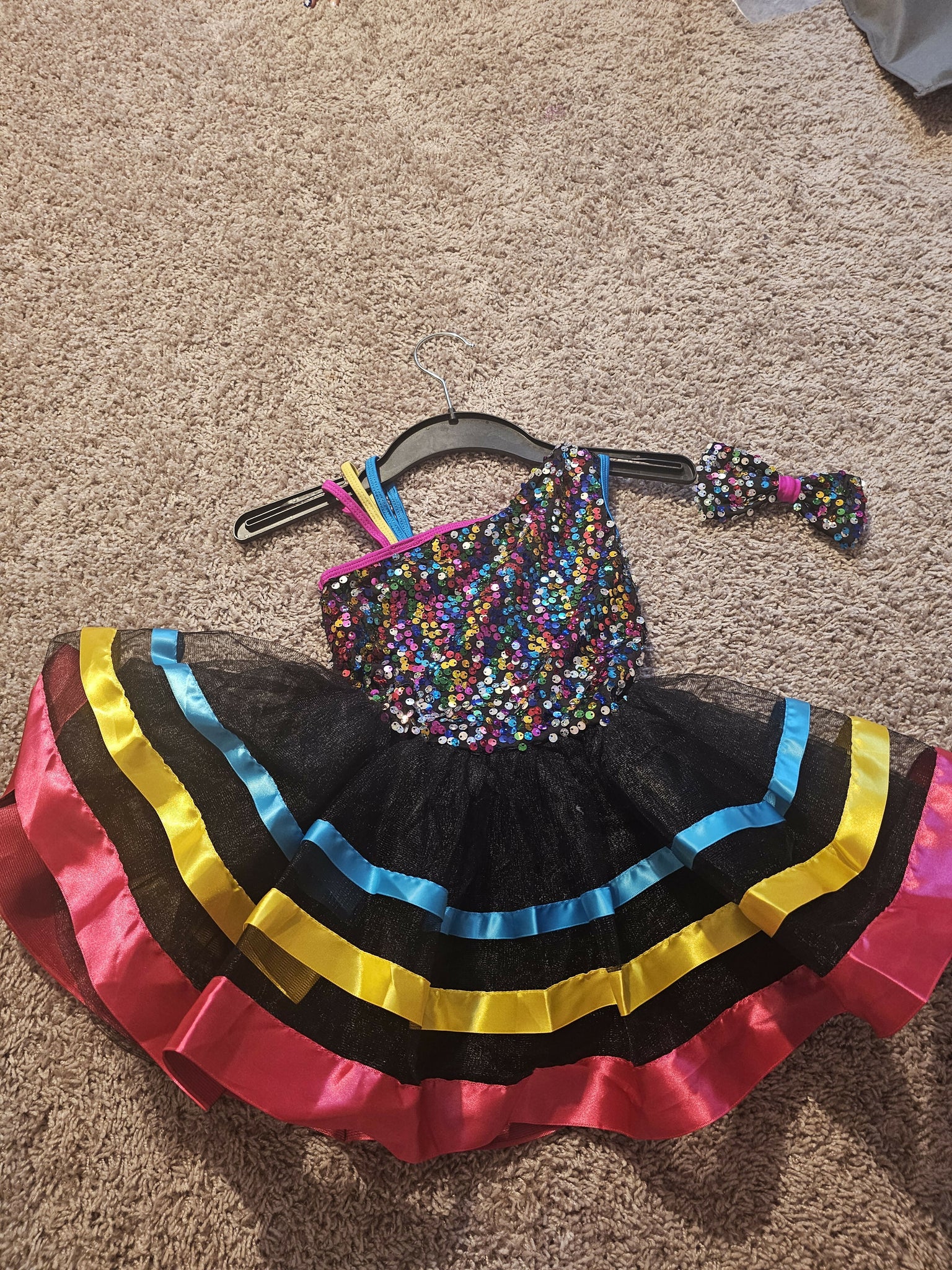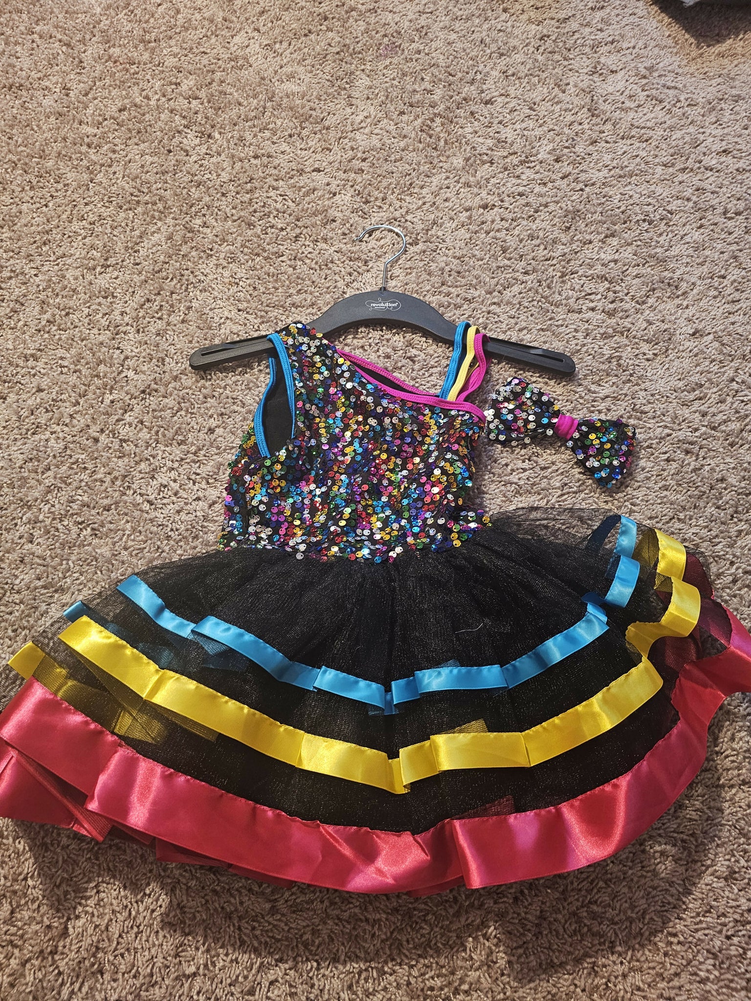 Revolution pink, yellow and blue sequin dress over black.  Comes with a matching hair bow.  Only worn for 1 dance recital.