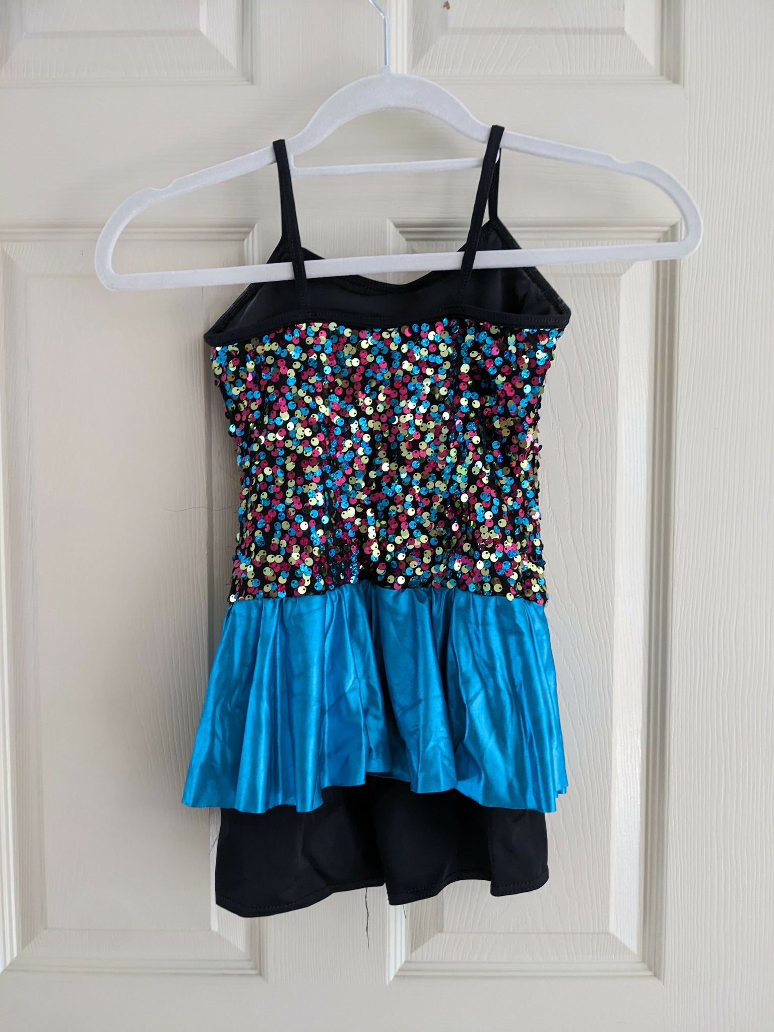 This sparkly costume features a black bodice covered in colorful sequins, accented with a shiny blue waistband and a matching flared skirt. It has black straps and built-in black shorts, perfect for jazz or tap routines.