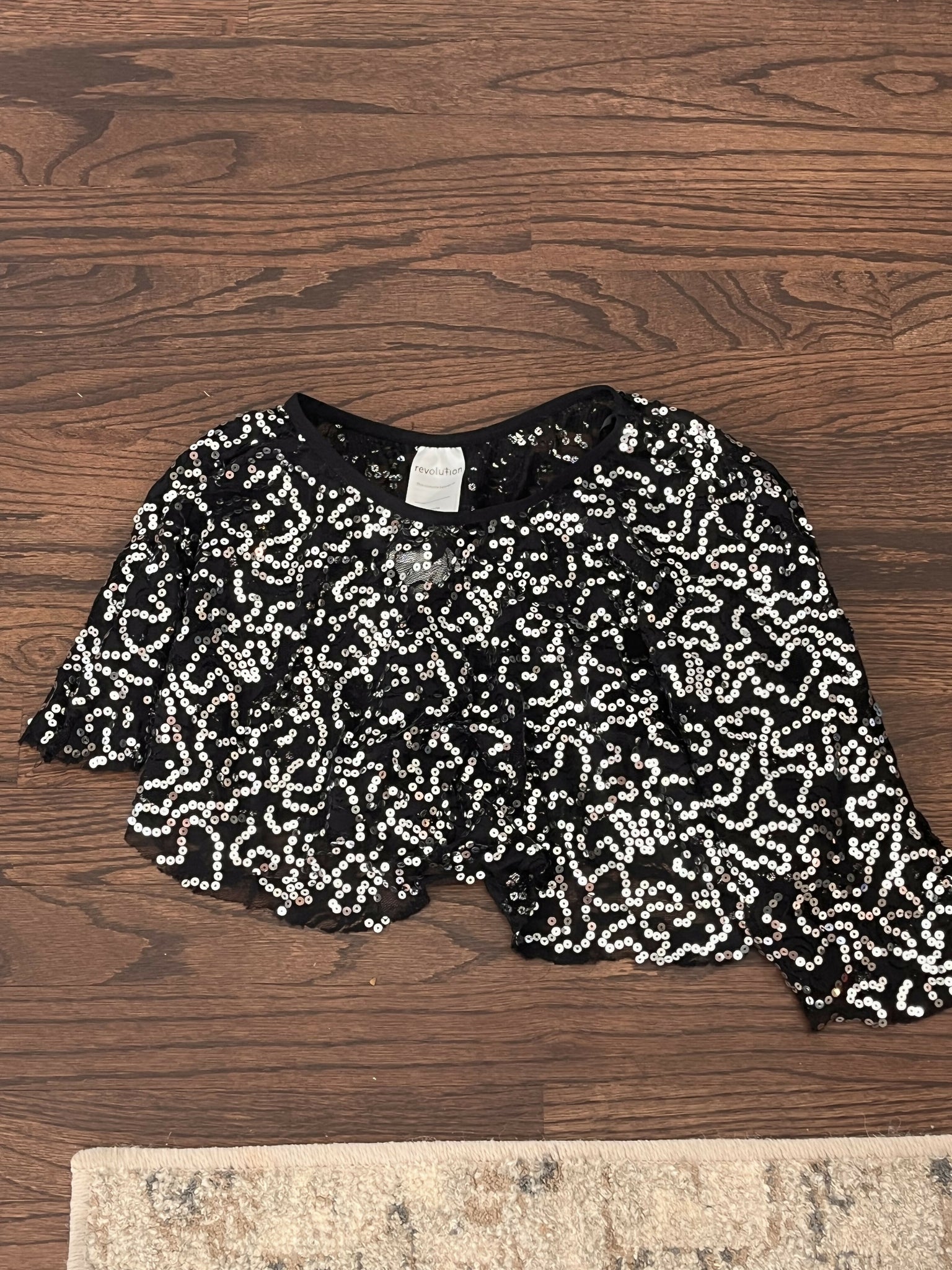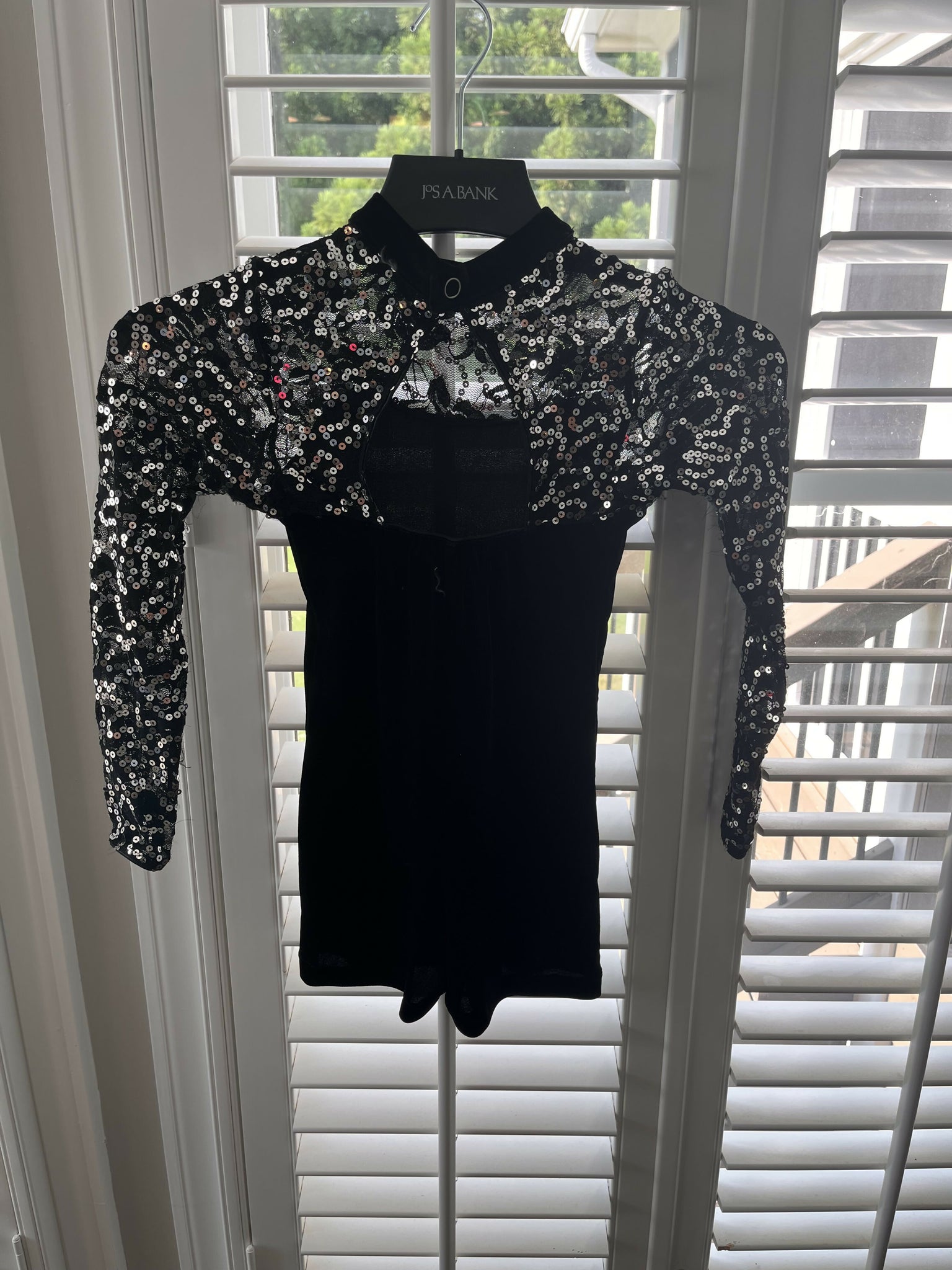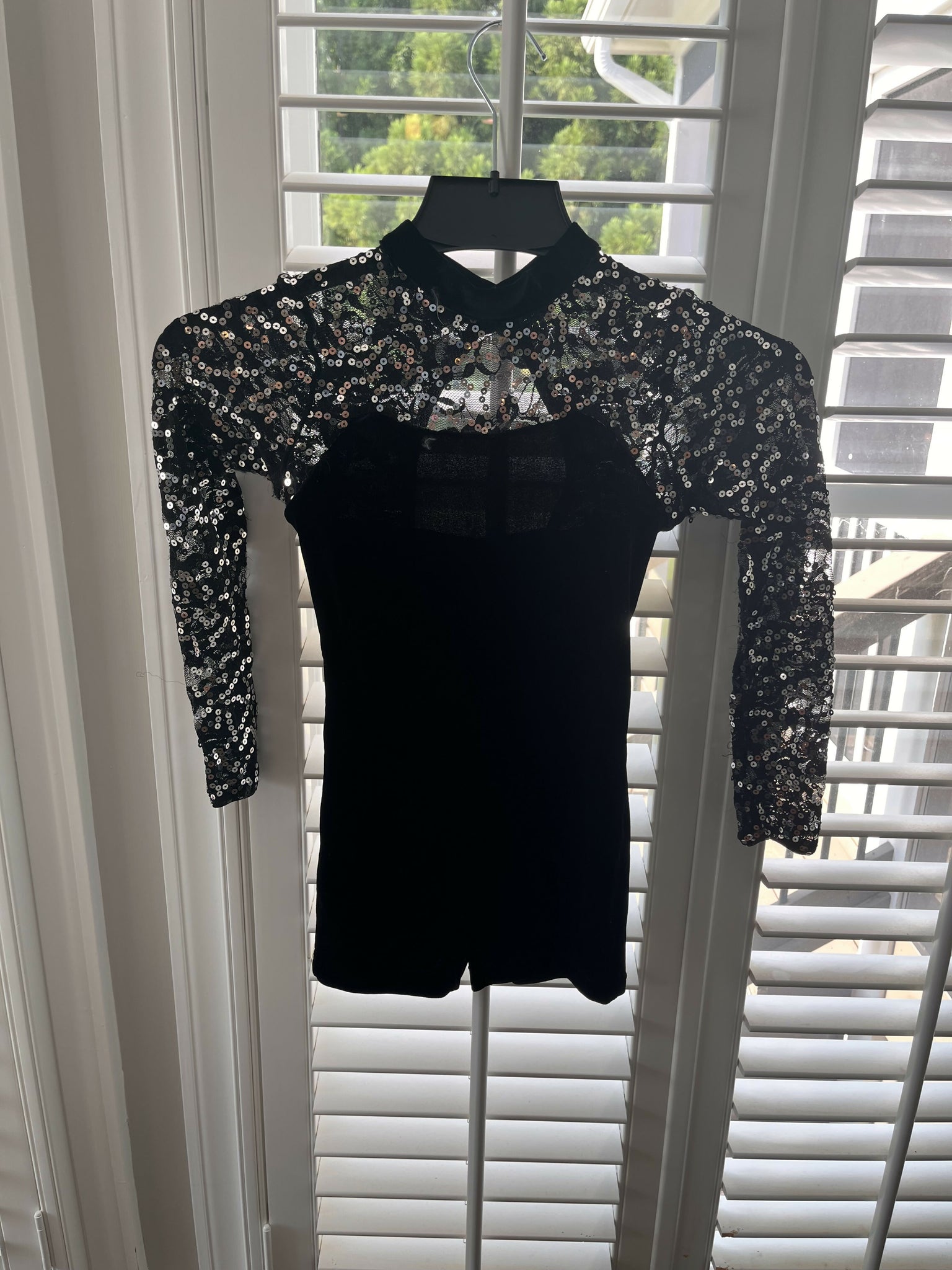 Revolution: Two piece black dance costume Top: black mesh long sleeves with silver sequins. Velvet body with shorts attached to the leotard. Clip in the back as well. Bottom: Angled sequin skirt that matches the upper portion of the bodysuit.