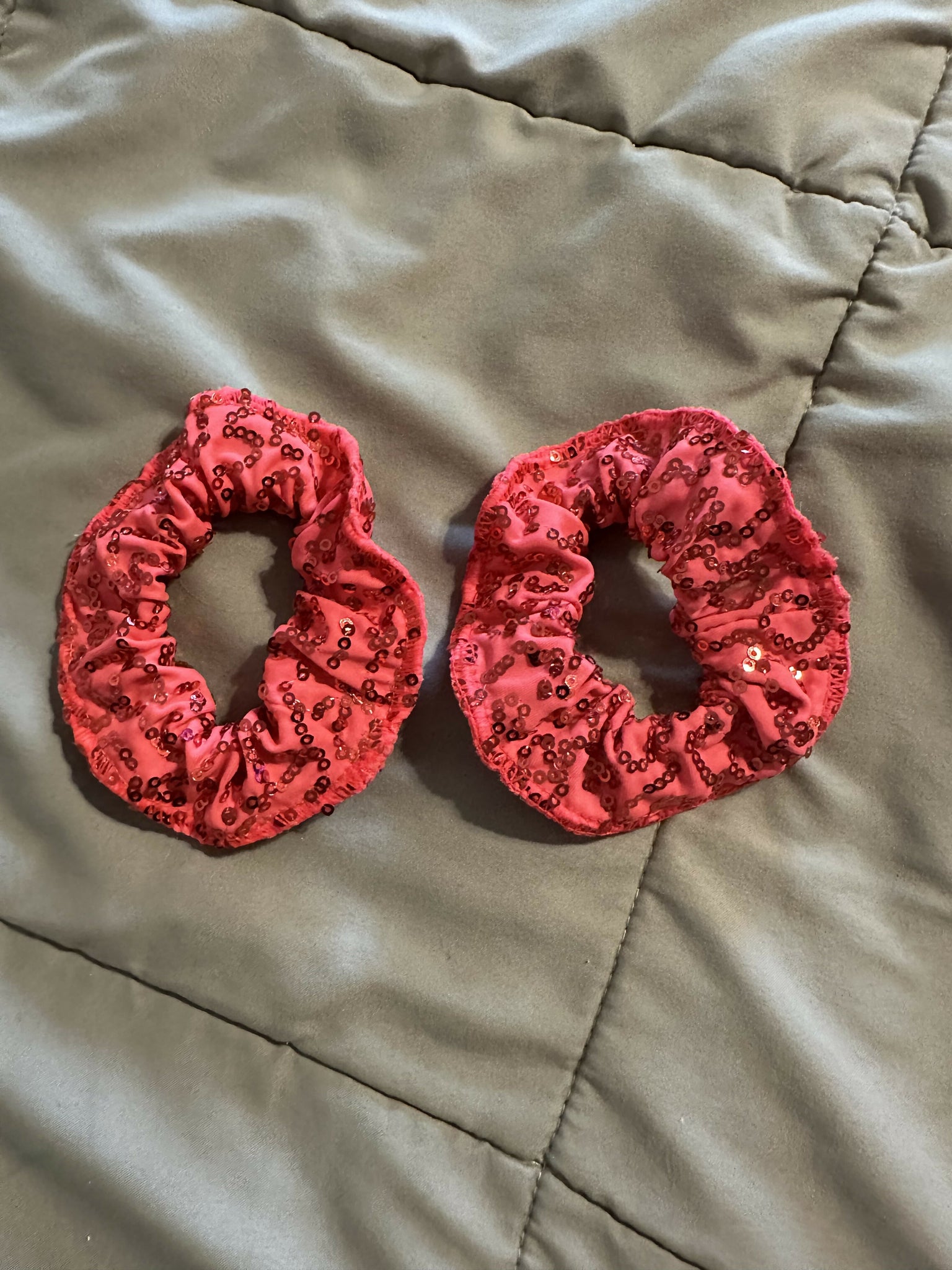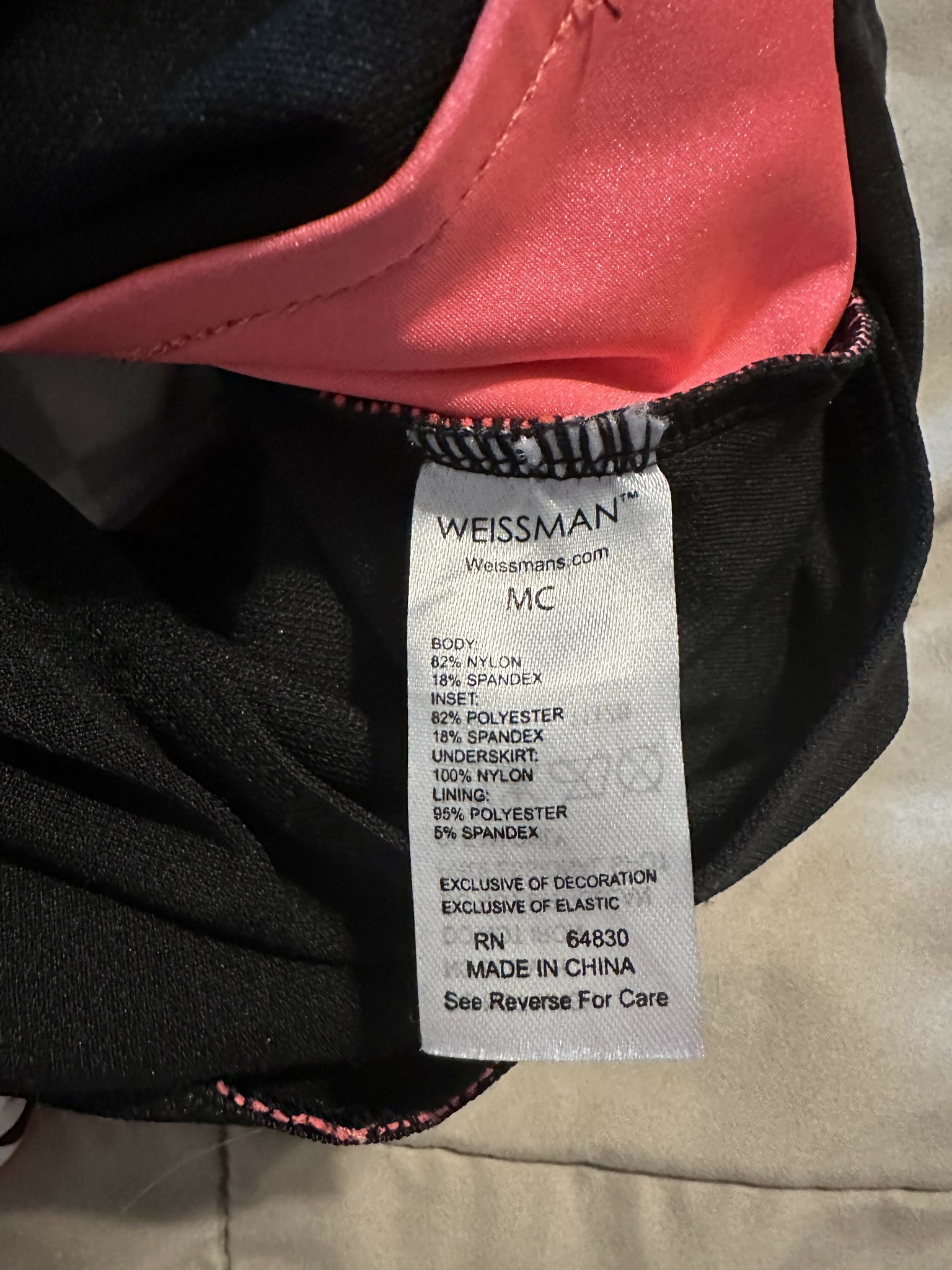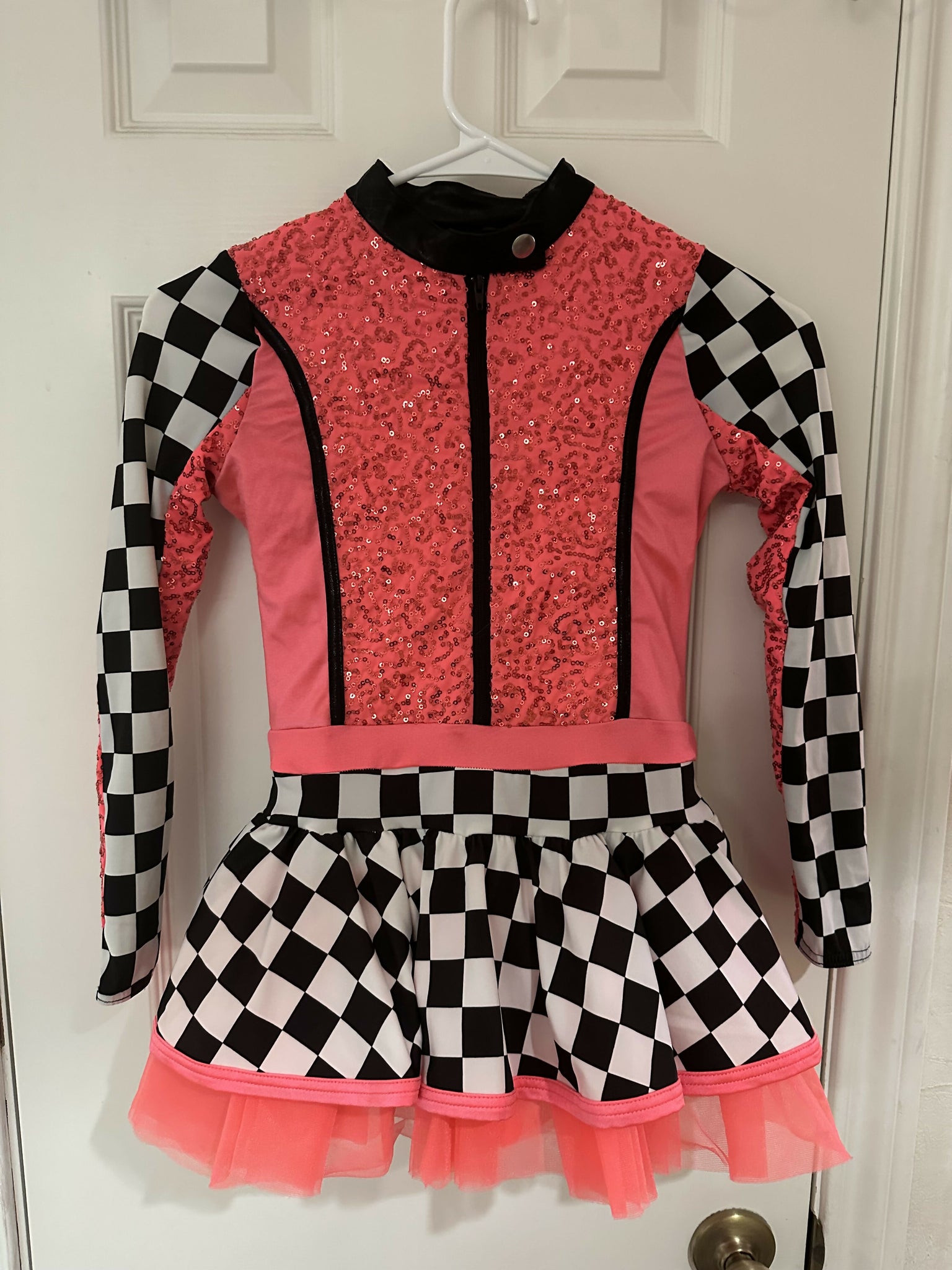 Weissman racer inspired biketard has a sequin spandex bodice with shiny spandex side panels. Front zipper and snap closure. Includes 2 sequin scrunchies. Salmon color. Size Medium child. No rips, stains, tears or holes. Worn once. Local pickup or shipping available.