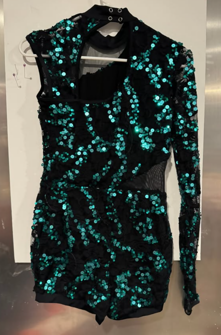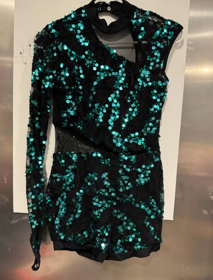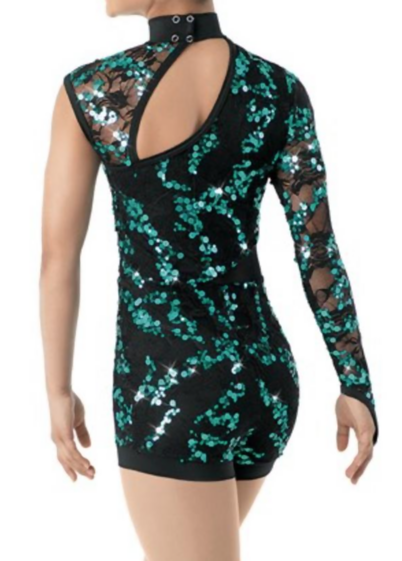 Weissman # 10183 Stay Closer Medium Adult - 2 available Asymmetrical, matte nylon/spandex biketard covered in dazzling streak lace Stretch-mesh insets at the waist and neckline and a single long point sleeve Collar snaps in back and accented by cutout between the shoulder blades Matte nylon/spandex leg bands at legline Glitter free! Smoke Free Animal Free