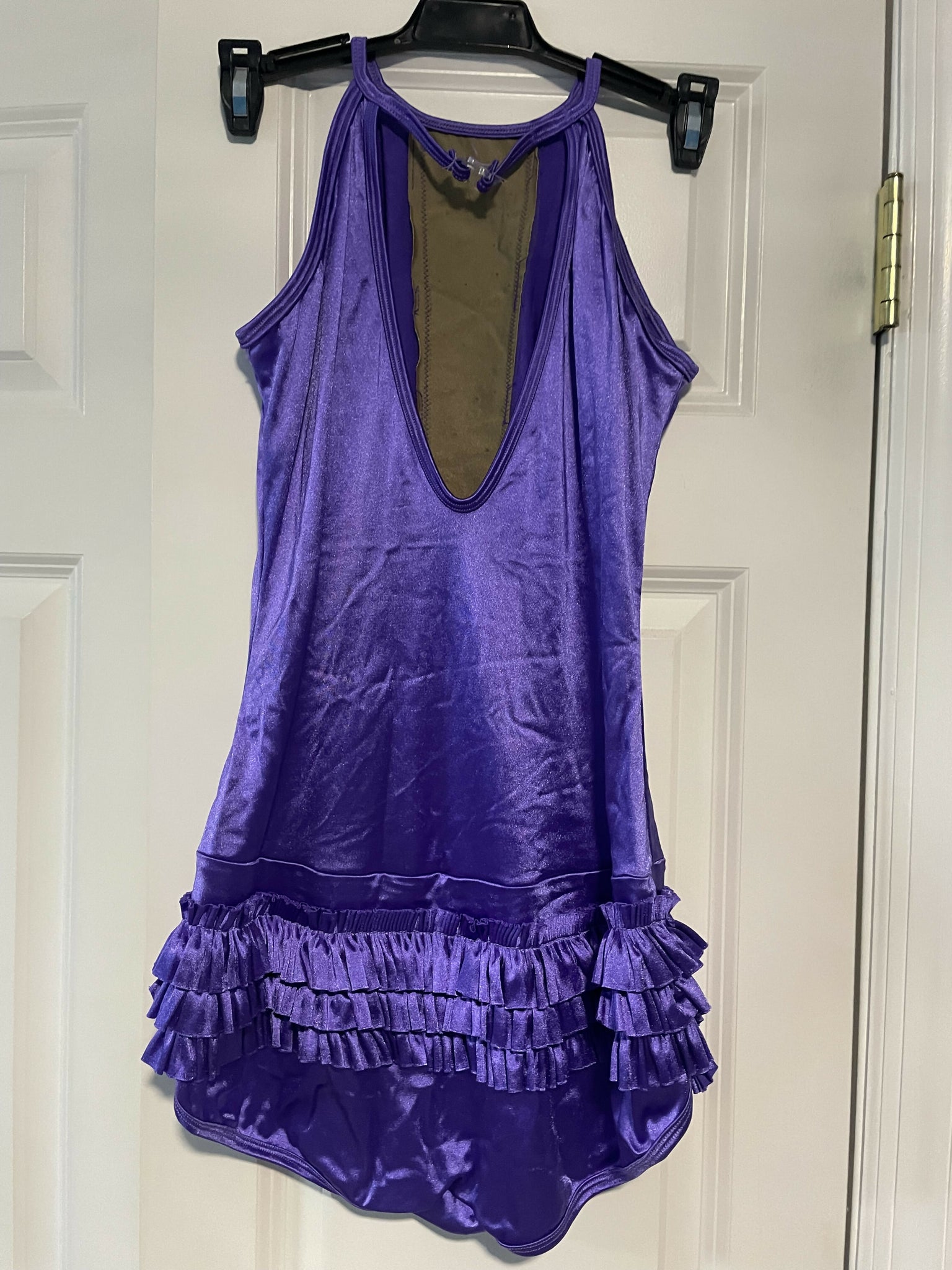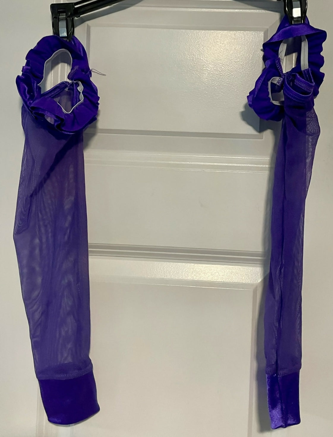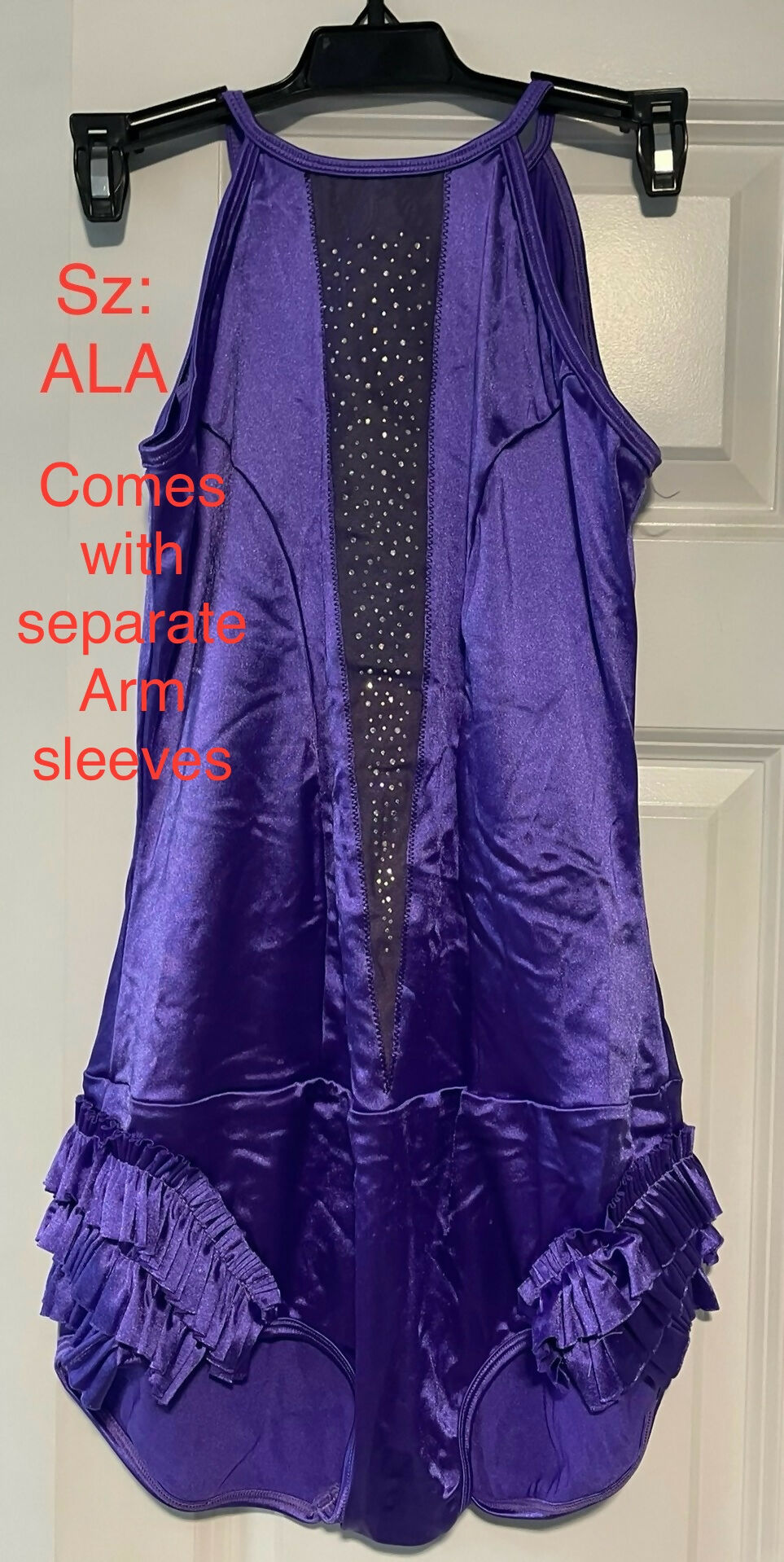 Sleeveless fancy Leotard with V shaped front accented with mini rhinestones, front/back ruffle detail, open V shape in the back and separate ruffled top see through long sleeves