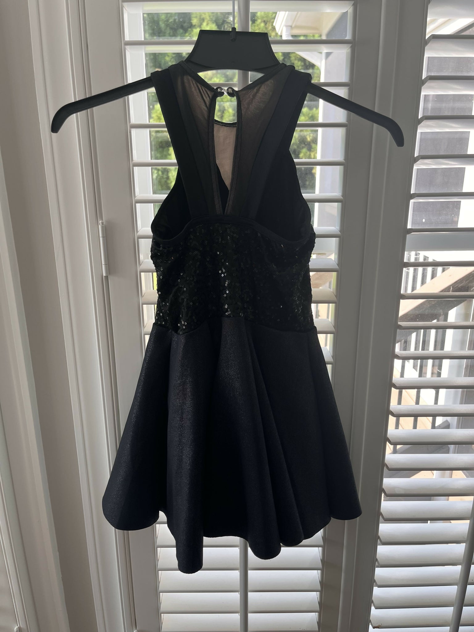 One piece: black in color, made with various materials, connects in the back with a clip, V neck in the front, mesh in the front and in the back, has shorts underneath, missing one button on the front v neck.