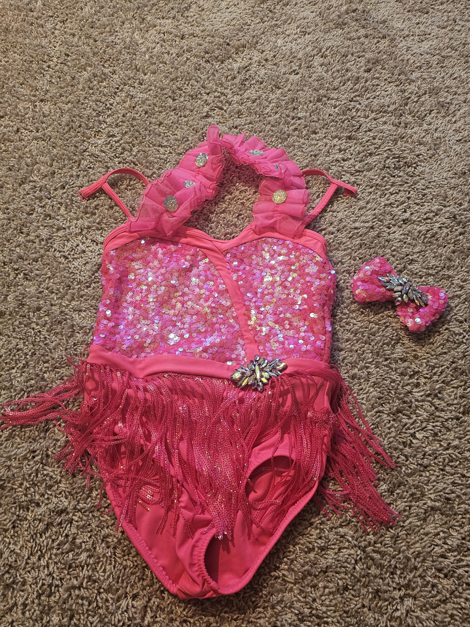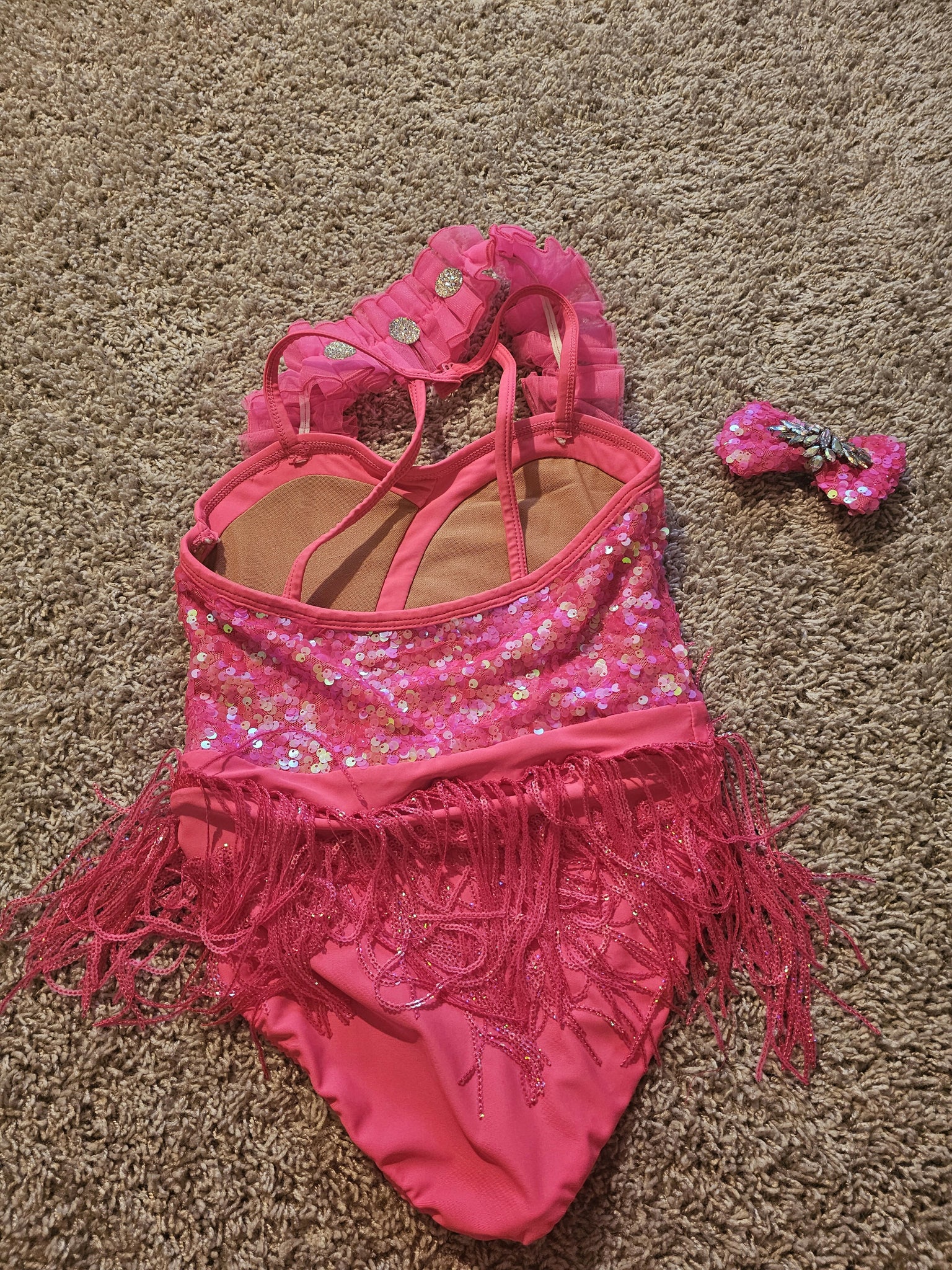 - Revolution bright pink jazz costume with sequin bodice and sequin fringe for a skirt. Top ruffle goes around the neck. Comes with a sequin hair bow. Only worn for 1 recital.