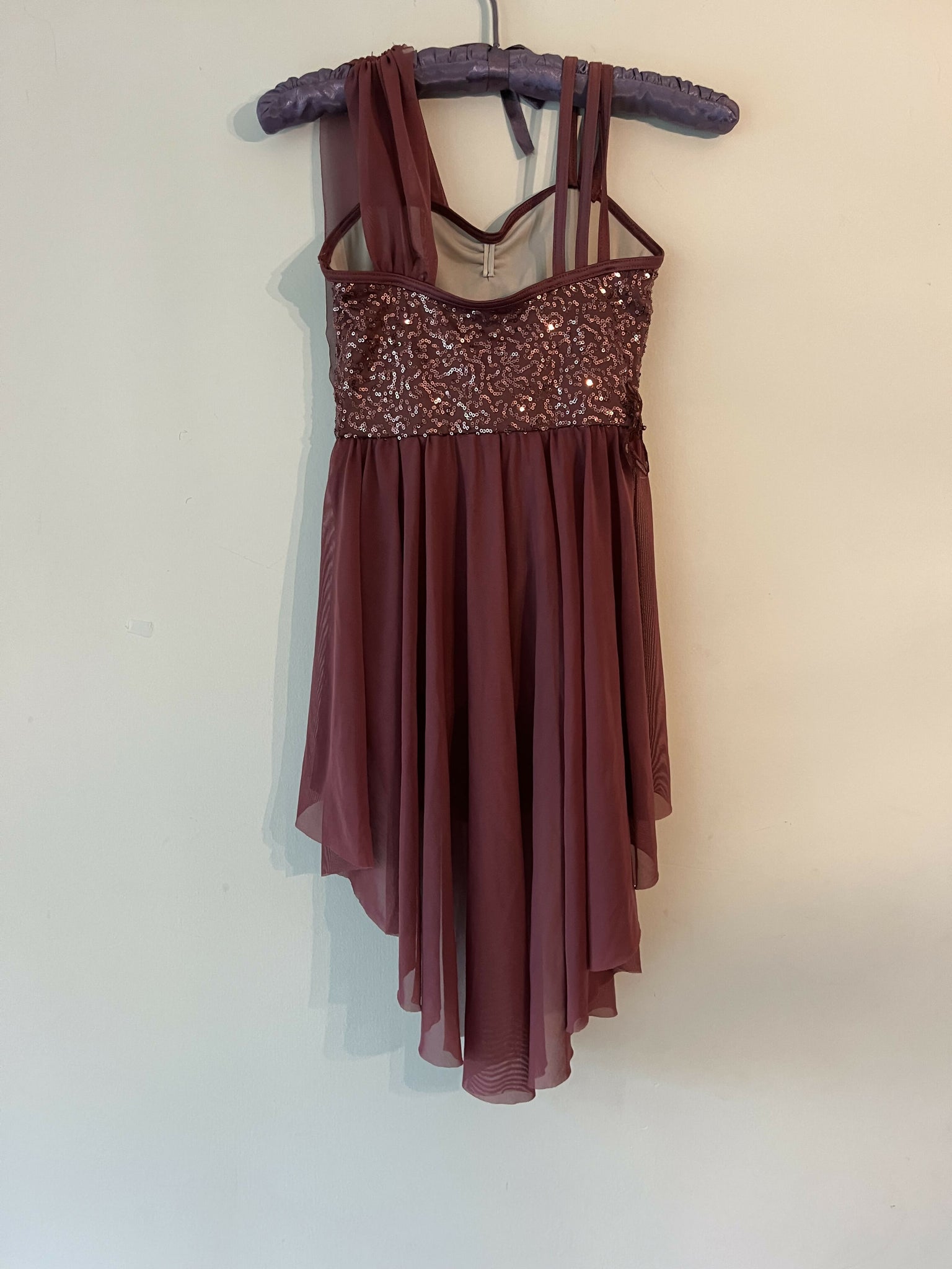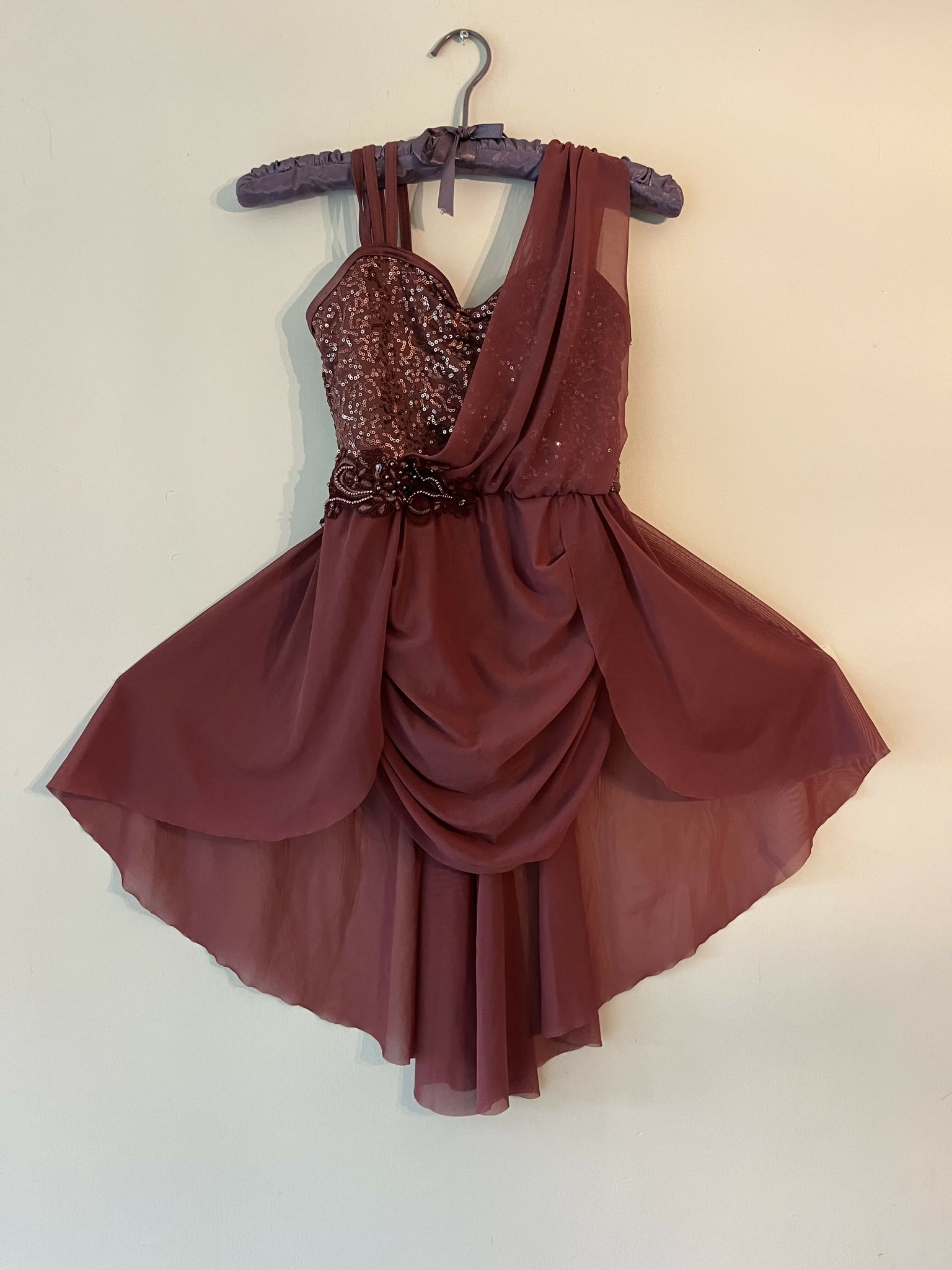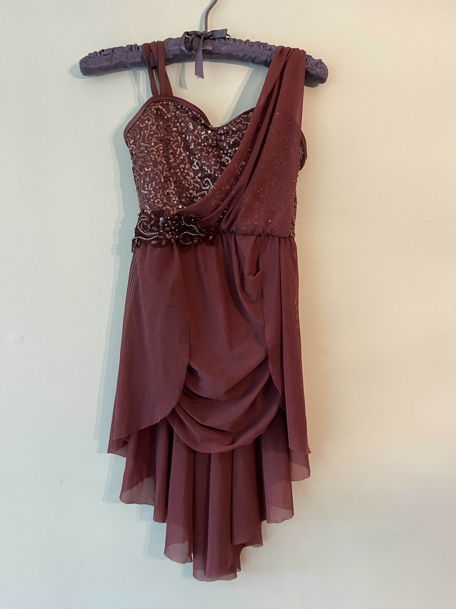 Weissman size MC (10-12)knee length high low hem leotard dress. Maroon sequined bodice with appliqué, layered mesh skirt. Appropriate for lyrical or ballet. Excellent condition.