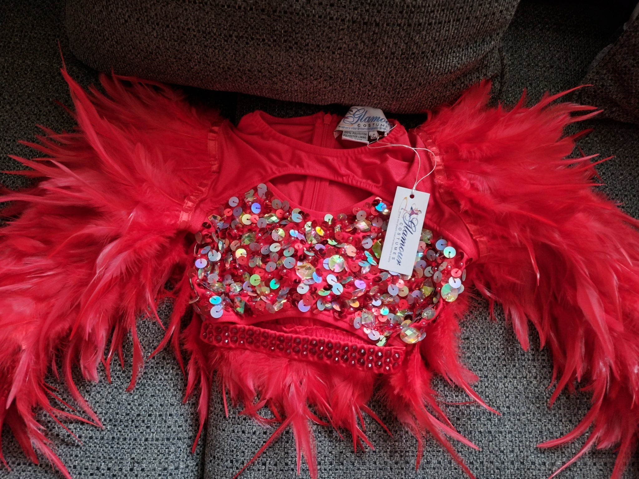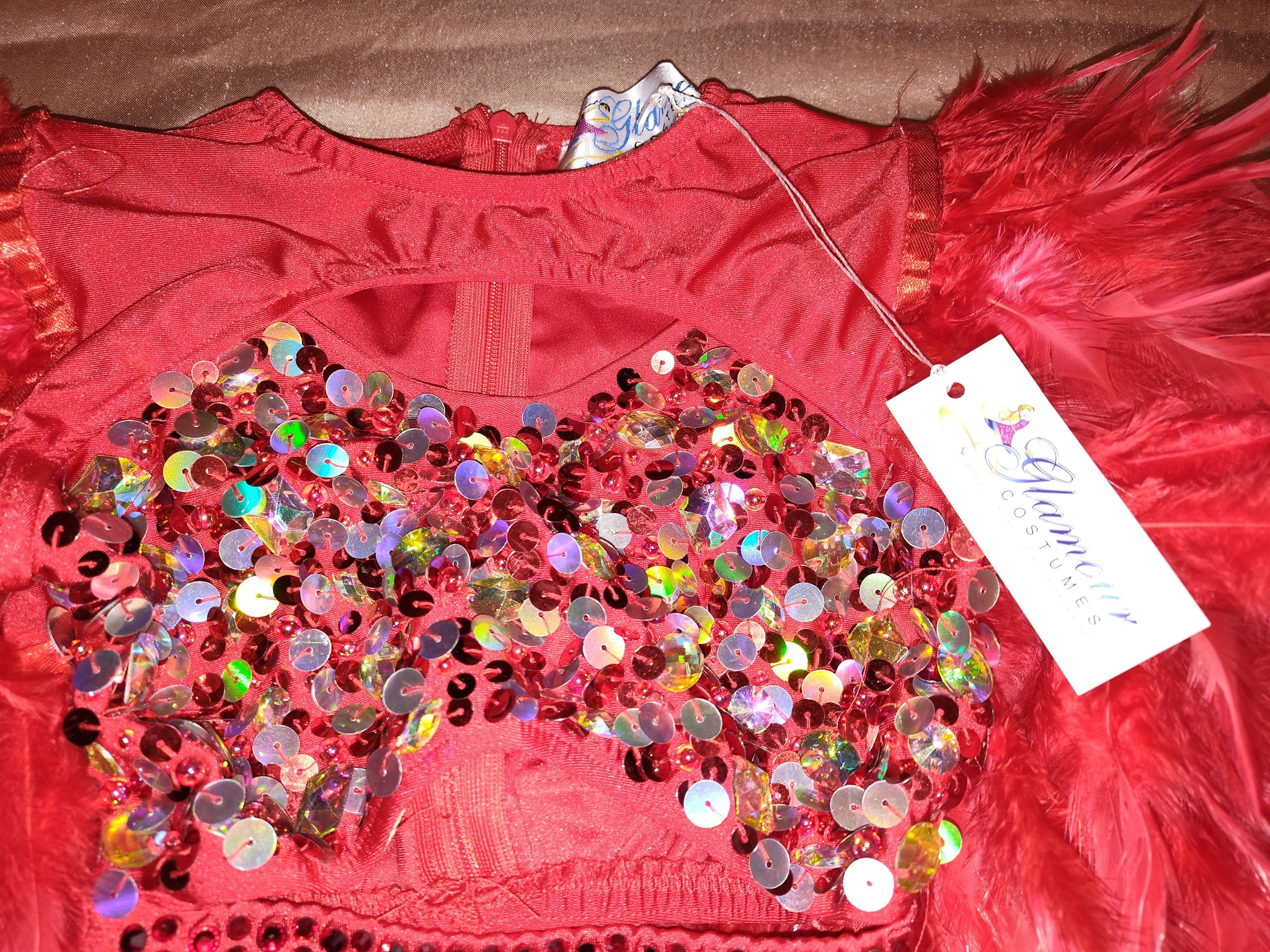 Beautiful 2 pc costume designed and made by "Glamour", Color Red, large sequins and red feathers